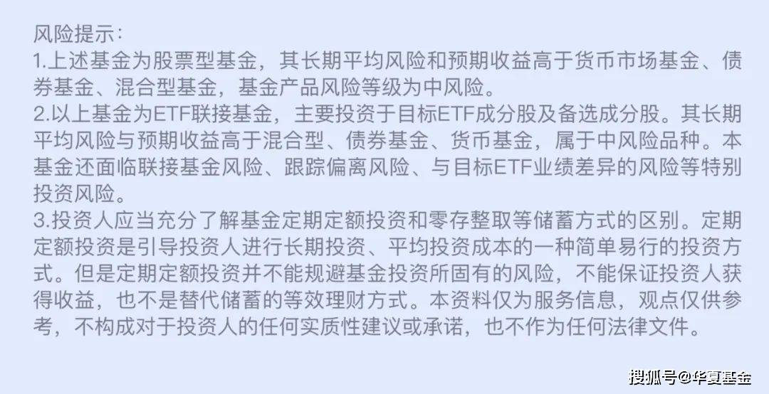 风险提示:1.上述基金为股票型基金,其长期平均风险和预期收益高于货币市场基金、债券基金、混合型基金,基金产品风险等级为中高风险。2.以上基金为ETF联接基金,主要投资于目标ETF成分股及备选成分股。其长期平均风险与预期收益高于混合型、债券基金、货币基金,属于中风险品种。本基金还面临联接基金风险、跟踪偏离风险、与目标ETF业绩差异的风险等特别投资风险。3.投资人应当充分了解基金定期定额投资和零存整取等储蓄方式的区别。定期定额投资是引导投资人进行长期投资、平均投资成本的一种简单易行的投资方式。但是定期定额投资并不能规避基金投资所固有的风险,不能保证投资人获得收益,也不是替代储蓄的等效理财方式。本资料仅为服务信息,观点仅供参考,不构成对于投资人的任何实质性建议或承诺,也不作为任何法律文件。4.基金管理人承诺以诚实信用、勤勉尽责的原则管理和运用基金资产,但不保证本基金一定盈利,也不保证最低收益。本基金的过往业绩及其净值高低并不预示其未来业绩表现,基金管理人管理的其他基金的业绩并不构成对本基金业绩表现的保证。5.基金不同于银行储蓄和债券等能够提供固定收益预期的金融工具,且不同类型的基金风险收益情况不同。投资者购买基金,既可能按其持有份额分享基金投资所产生的收益,也可能承担基金投资所带来的损失。6.基金管理人的适当性匹配意见不表明其对产品或者服务的风险和收益做出实质性判断或者保证。7.各销售机构关于适当性的匹配意见不必然一致,且基金合同中关于基金的风险收益特征与基金的风险等级因考虑因素不同,存在差异。8.本页面基金产品风险等级由基金销售机构提供,且投资者应符合销售机构适当性匹配原则。9.基金管理人提醒投资者基金投资的“买者自负”原则,在投资者做出投资决策后,基金运营状况、基金份额上市交易价格波动与基金净值变化引致的投资风险,由投资者自行负责。基金管理人、基金托管人、基金销售机构及相关机构不对基金投资收益做出任何承诺或保证。10.投资者在投资本基金之前,请仔细阅读本基金的《基金合同》、《招募说明书》和《产品资料概要》等基金法律文件,充分认识本基金的风险收益特征和产品特性,认真考虑本基金存在的各项风险因素,并根据自身的投资目的、投资期限、投资经验、资产状况等因素充分考虑自身的风险承受能力,在了解产品情况及销售适当性意见的基础上,理性判断并谨慎做出投资决策,独立承担投资风险。11.本基金由华夏基金管理有限公司依照有关法律法规及约定申请募集,并经中国证券监督管理委员会许可注册。本基金的基金合同、基金招募说明书和基金产品资料概要已通过中国证监会基金电子披露网站http://eid.csrc.gov.cn/fund/和基金管理人网站www.chinaamc.com进行了公开披露。中国证监会对本基金的注册,并不表明其对本基金的投资价值、市场前景和收益作出实质性判断或保证,也不表明投资于本基金没有风险。12.本资料中推介的产品由华夏基金发行与管理。13.市场有风险,投资需谨慎。