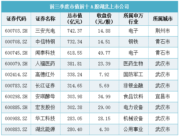 三安光电、中信特钢、闻泰科技、人福医药、高德红外、长江证券、安琪酵母、宏发股份、华工科技、湖北能源市值排名前十。