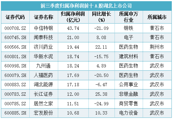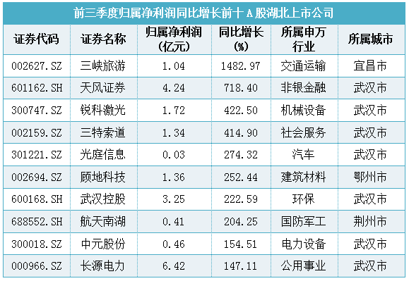 前三季度,109家A股湖北上市公司实现盈利,占比超七成。归属净利润超10亿元的企业有10家,过亿元企业有59家。