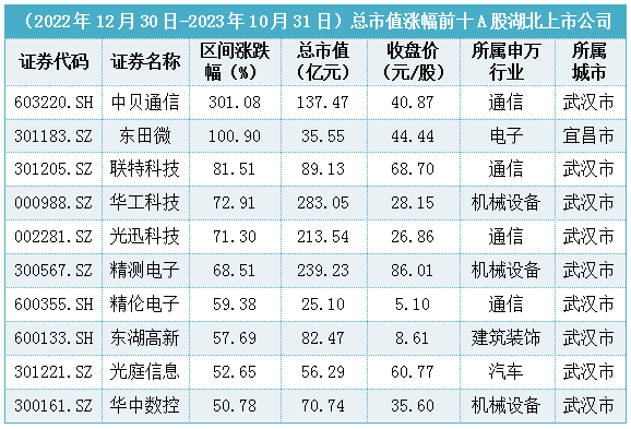 截至10月31日的数据显示,A股湖北上市公司总市值为1.39万亿元,市值超百亿元的企业有36家。
