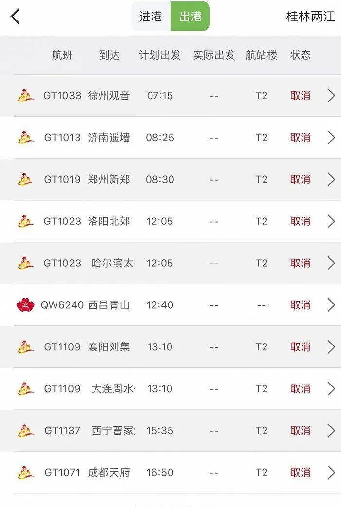 桂林两江机场11月3日出港取消航班计划,GT为桂林航空代码。图片来源:航旅纵横截图