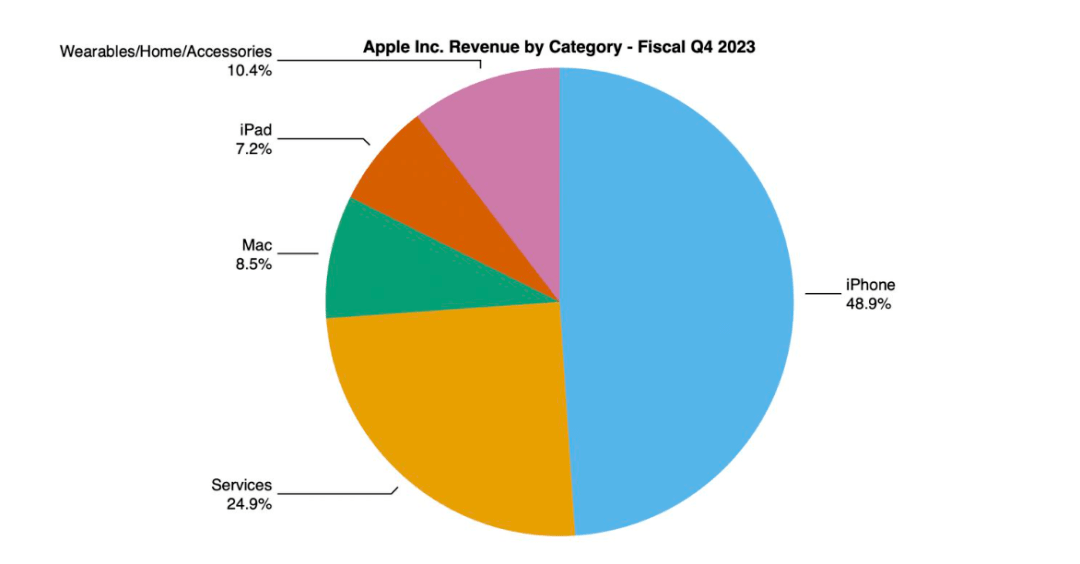 具体业务上,iPhone销售份额占比48.9%,收入为438亿美元,同比增长3%。库克称“iPhone的9月份季度收入创纪录,iPhone 15销量好于iPhone 14,但由于iPhone 15 Pro/Max供应限制,所以影响了iPhone总收入,预计备货跟上后12月会增长”;还表示“在中国大陆,我们在该季度创下了iPhone的季度记录。”