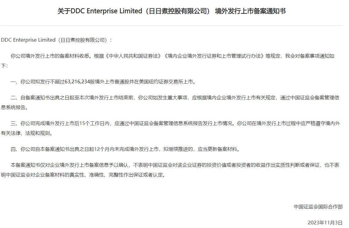 智通财经APP获悉,11月3日,证监会国际合作部发布关于DDC Enterprise Limited(日日煮控股有限公司) 境外发行上市备案通知书。该公司拟发行不超过63,216,234股境外上市普通股并在纽交所上市。据悉,此次IPO由招银国际、The Benchmark Company、国泰君安国际、艾德证券以及老虎证券共同担任承销商。