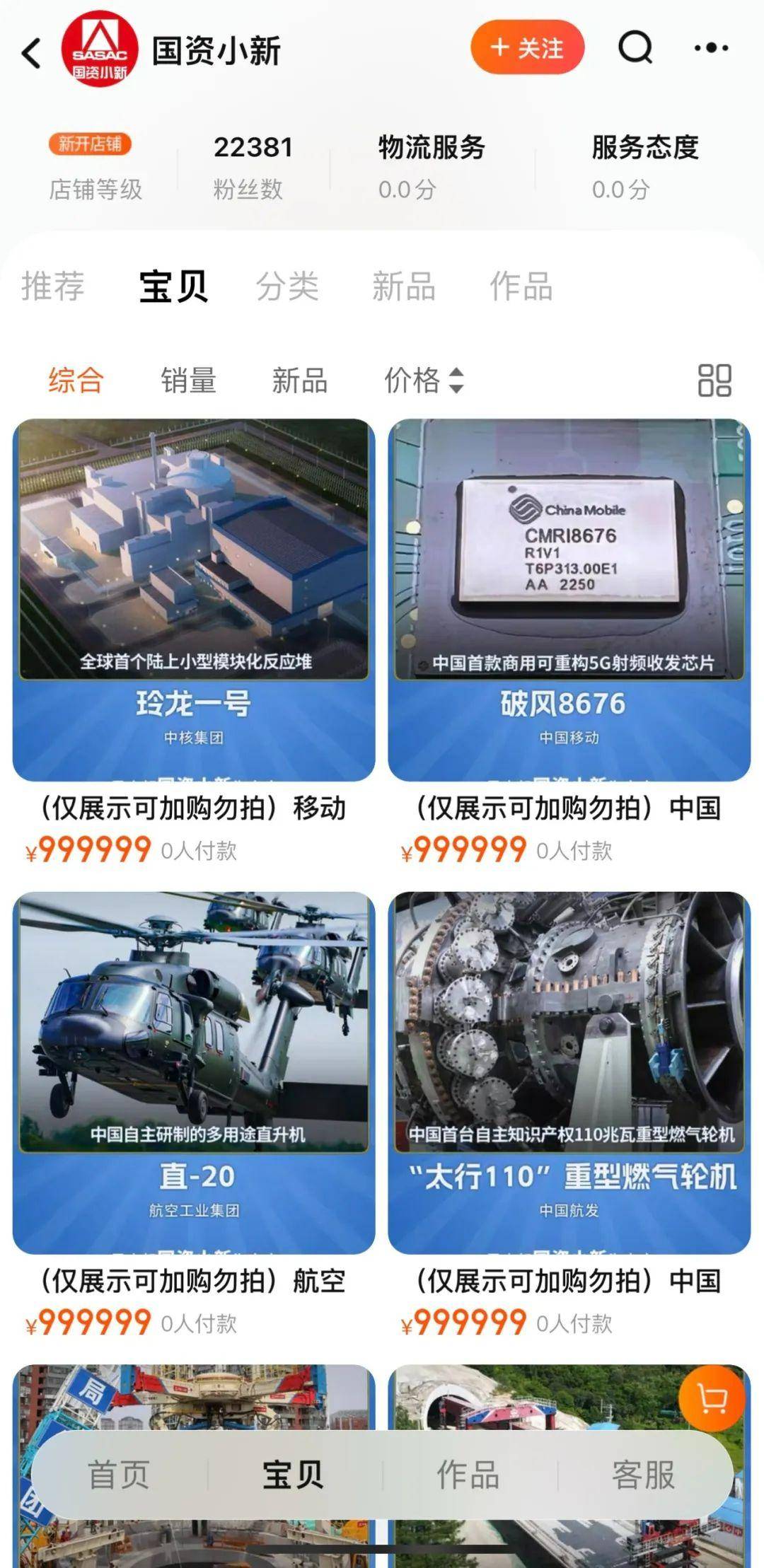 张灏然表示,“国资小新”淘宝店是在10月30日正式上线,包含精心挑选的16件“大国重器”。在活动启动第二天,全球首个陆上商用小型核反应堆“玲珑一号”、中国首款可重构5G射频首发芯片即登上多个平台热搜。