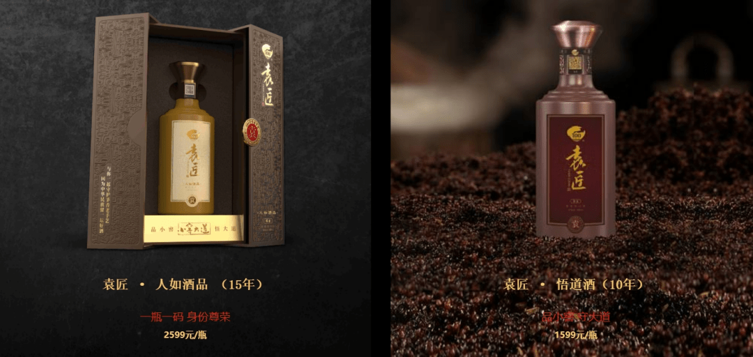 袁匠有一款叫“酒牛亿毛”的产品,100万元/套。其他几款,袁匠•得道酒(20年),售价4999元/瓶;袁匠•人如酒品(15年),售价2599元/瓶;袁匠•悟道酒(10年),售价1599元/瓶。