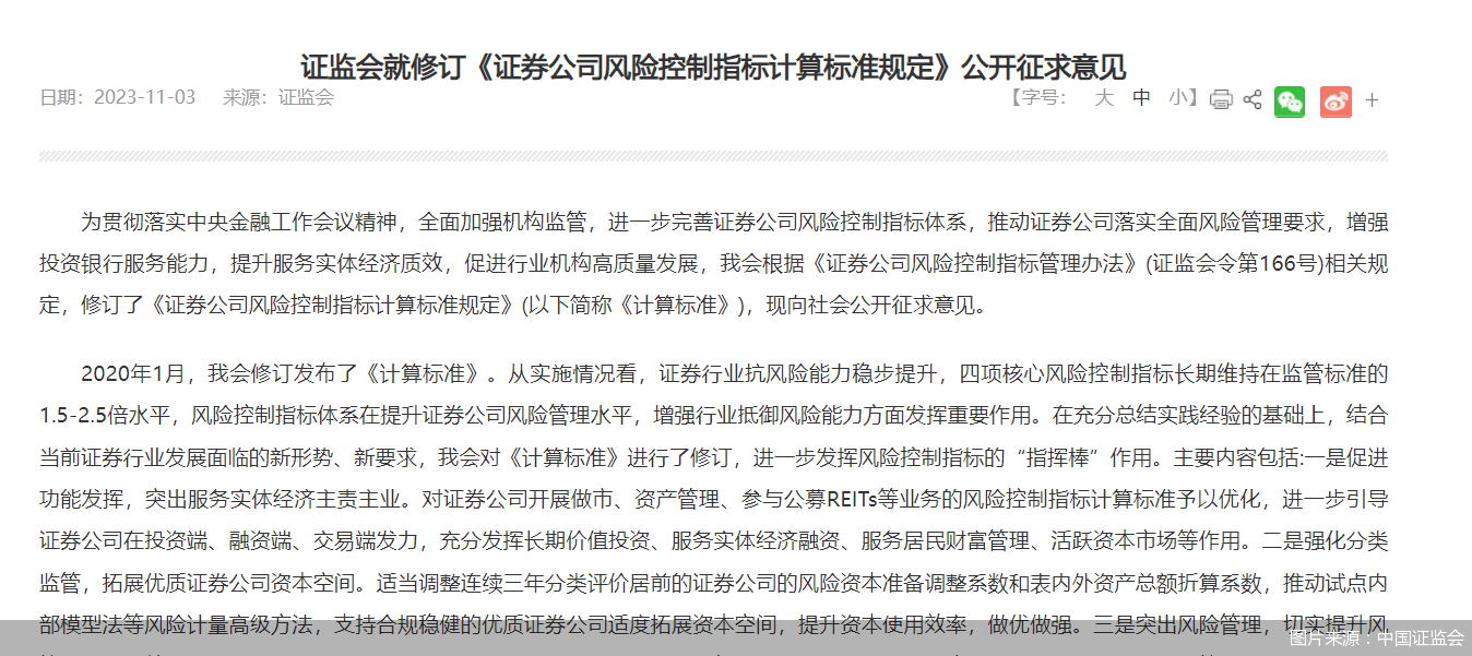 北京商报讯(记者 刘宇阳 郝彦)11月3日,中国证监会发布公告表示,为贯彻落实中央金融工作会议精神,全面加强机构监管,进一步完善证券公司风险控制指标体系,推动证券公司落实全面风险管理要求,增强投资银行服务能力,提升服务实体经济质效,促进行业机构高质量发展,中国证监会根据《证券公司风险控制指标管理办法》相关规定,修订了《证券公司风险控制指标计算标准规定》(以下简称《计算标准》),现向社会公开征求意见。