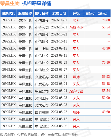 截至2023年11月3日收盘,荣昌生物(09995.HK)报收于43.9港元,上涨0.57%,换手率1.03%,成交量196.15万股,成交额8509.43万港元。投行对该股的评级以买入为主,近90天内共有12家投行给出买入评级,近90天的目标均价为57.18港元。中信建投最新一份研报给予荣昌生物买入评级,目标价70.8港元。