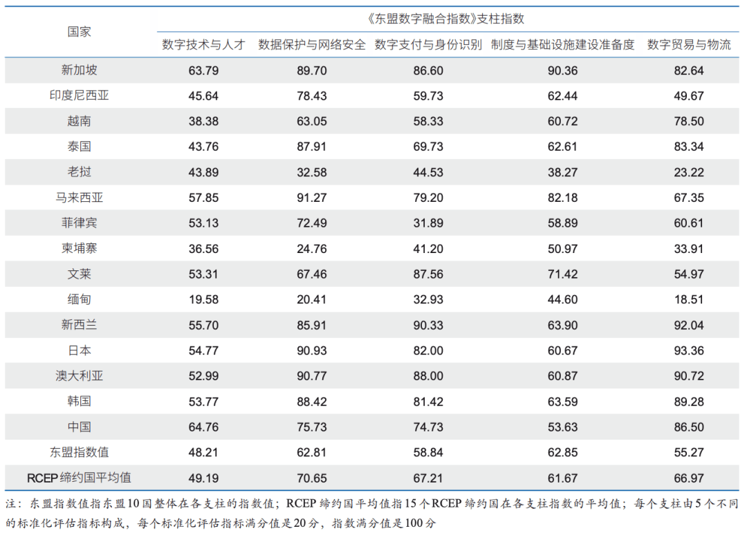 数字经济是生产力主体将数字技术与生产力要素有机融合,创造数字产品和其他产品价值的活动或经济形态。数字经济发展程度可通过“数字贸易与物流”支柱指数及其标准化评估指标得以体现。RCEP缔约国在该支柱的平均值为66.97,其中日本、新西兰、澳大利亚等非东盟发达国家的指数均超90,紧随其后的是韩国、中国、泰国和新加坡,都超过80,远超东盟指数值(55.27);相比而言,老挝(23.22)、柬埔寨(33.91)和缅甸(18.51)的支柱指数较低。具体到标准化评估指标,跨境贸易和政府海关使用数字技术程度指标值稍低,仅为11.20;数字认证和电子签章的使用程度的指标值与物流服务的竞争力和质量指标值稍微高一点,分别为12.00和12.07。整体而言,发达国家和不发达国家在数字生产力应用和转化能力方面的差距较大,甚至呈现两极化。