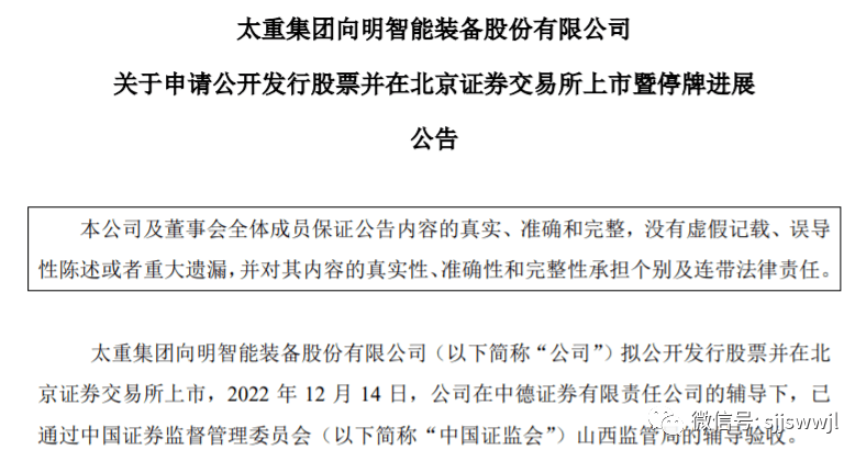 2022年,在新三板挂牌5年的太重向明终于展开了切实的上市动作。当年3月,太重向明提交北交所上市辅导备案申请材料,辅导机构为中德证券。同年12月14日,公司称已通过中国证监会山西监管局的辅导验收,正式向北京证券交易所报送了向不特定合格投资者公开发行股票并上市的申报材料。