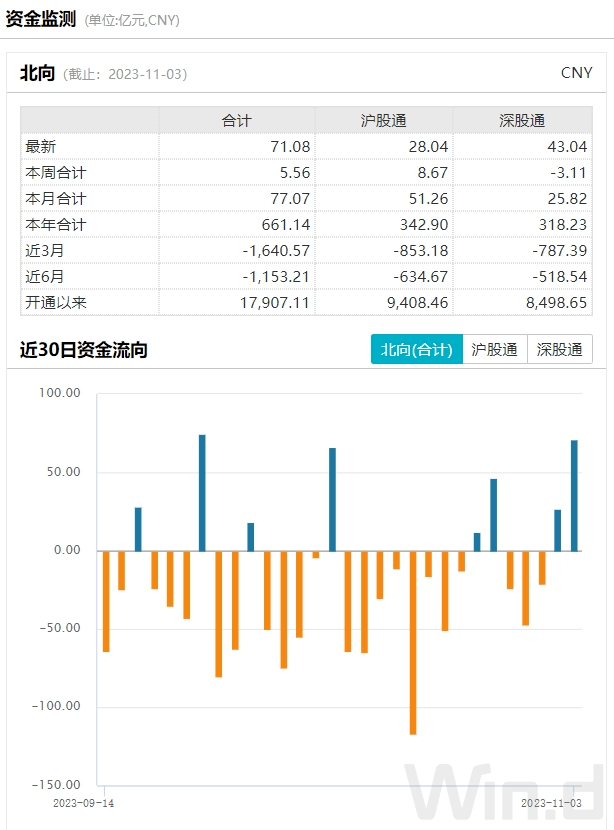 北上资金大幅净流入。11月3日,北上资金大幅净买入71.08亿元,连续2日净买入,本周净买入5.56亿元。从近期北上资金变动趋势来看,开始呈现出明显的回流迹象,对A股资金面的改善也将起到积极影响。