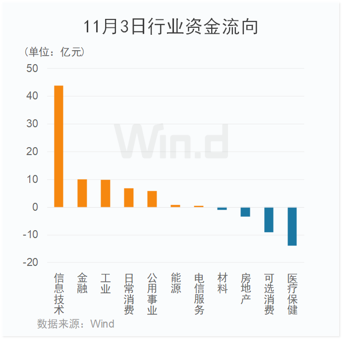 从11月3日行业资金流向来看,主力资金净流入50多亿元,多数板块净流入。其中,信息技术板块净流入额40多亿元,位居首位;金融、工业、日常消费等板块净流入额亦较高。医疗保健、可选消费等板块小幅净流出。