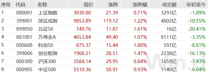截至11月3日收盘,上证指数涨0.71%报收于3030.80点;深成指涨1.22%报收于9853.89点;创业板指涨1.47%报收于1968.21点,万得全A总成交8111亿元。