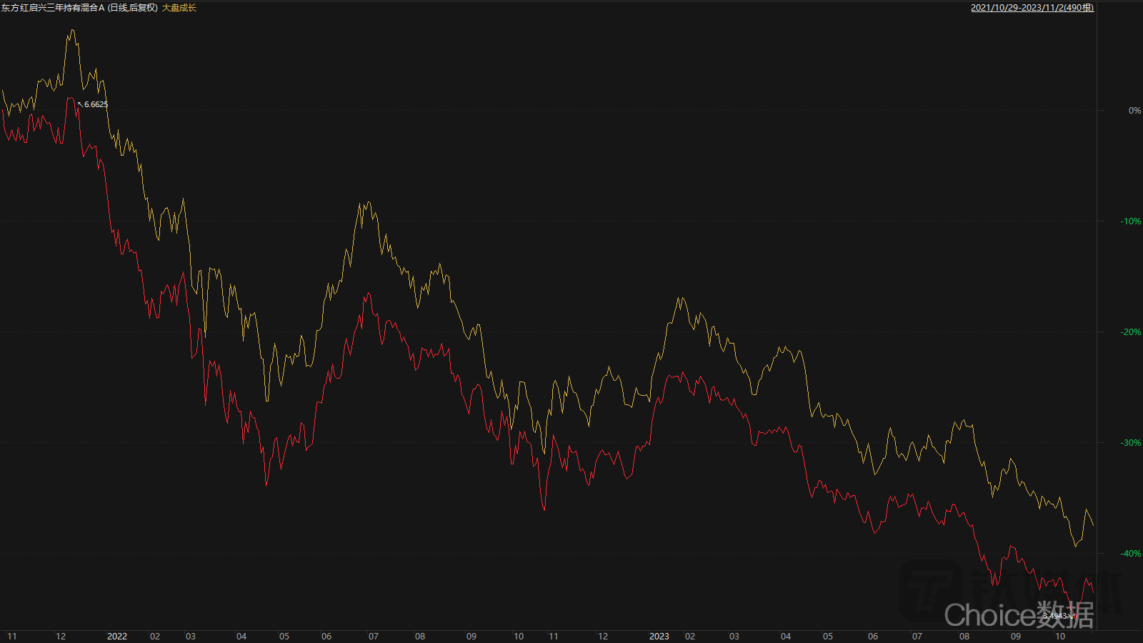 任莉只道出了封闭产品在行情有利时的一面,却没有提及另一面——在行情不利时客户也无法赎回止损。Choice终端显示,东证资管全部161支基金中,成立时间超过3年的有78支。截止到2023年11月2日,其中,近3年回报为负的基金有27支,合计规模为706亿元人民币,收益率中位数为-25.5%,亏损超过20%的基金合计规模为527亿元;近3年回报为正的基金有51支,合计规模为715亿元,收益率中位数为8.11%,盈利超过20%的基金仅2支,合计规模30.93亿元。回报为负的27支基金全部为股票或偏股混合型基金,回报为正的51支基金中只有东方红新动力混合A(000480)和东方红京东大数据混合A(001564)是偏股混合型基金,余下49支都是纯债或权益占比不足20%的偏债混合型基金。对比来看,与东证资管风格接近的沪深300ETF(515310)近3年跌幅为15.86%。上述数据表明,封闭产品除了帮助东证资管在行情下跌时维持自身规模以继续赚取手续费外,并没有真的陪伴客户穿越牛熊——通过长期持有赚到收益。