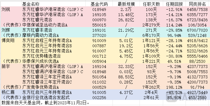 但是,这些“新鲜血液”不仅没能扭转东证资管的颓势,其中几位的回撤控制与新人相比也是不遑多让。最早加盟东证资管的杨仁眉管理东方红启兴三年持有混合A已有2年4天的时间,任期内回报为-43.52%;分位排名4927/5449。傅奕翔管理东方红启程三年持有混合A有1年121天时间,任期内回报为-28.1%;刘辉虽然管理东方红睿丰混合只有271天的时间,但净值已经跌去了近3成;刘锐与苗宇任职时间尚短,任期内分位排名均在后1/2。