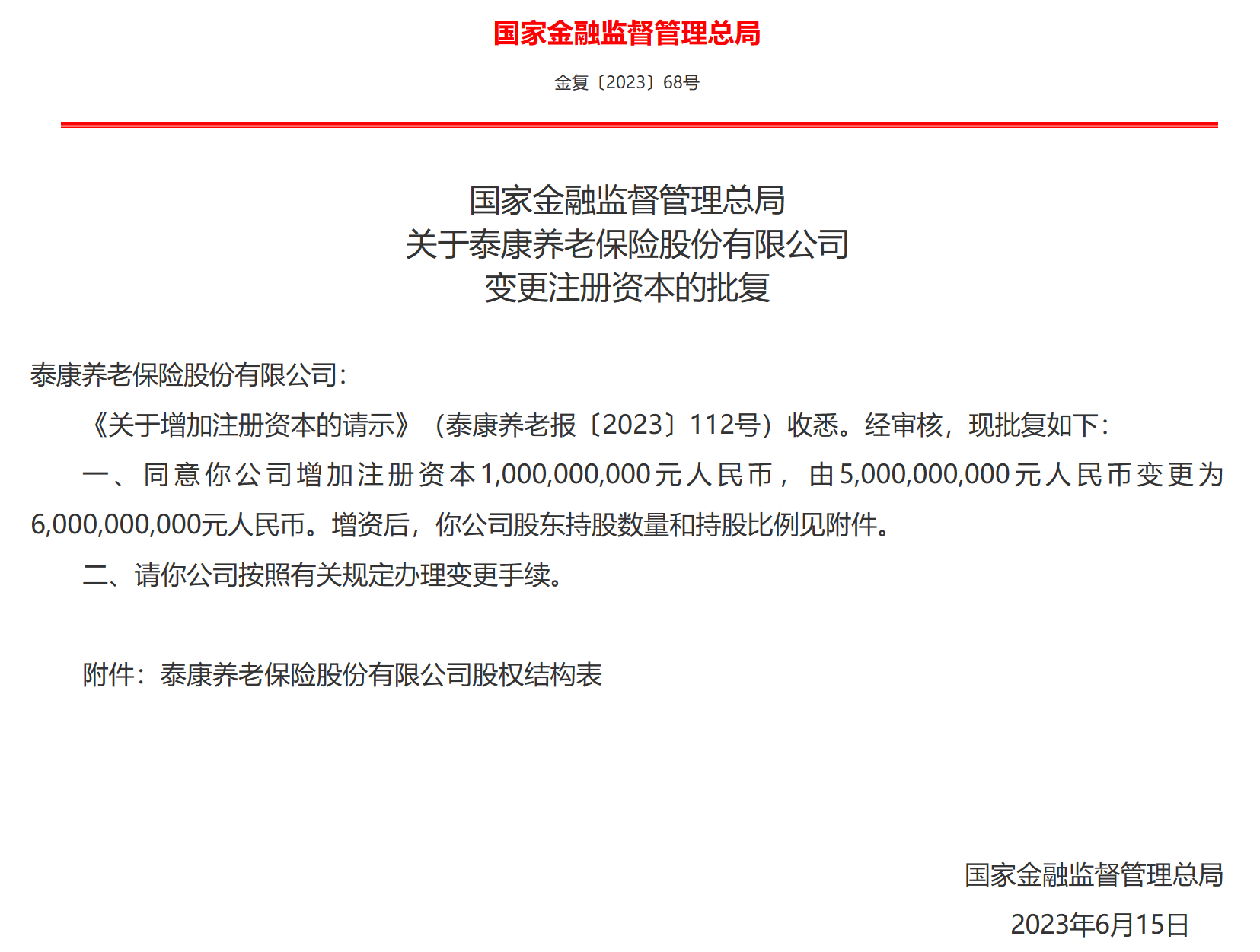 金融界消息,6月21日,国家金融监督管理总局发布了《关于泰康养老保险股份有限公司变更注册资本的批复》,同意增加注册资本10亿元人民币,由50亿元人民币变更为60亿元人民币。