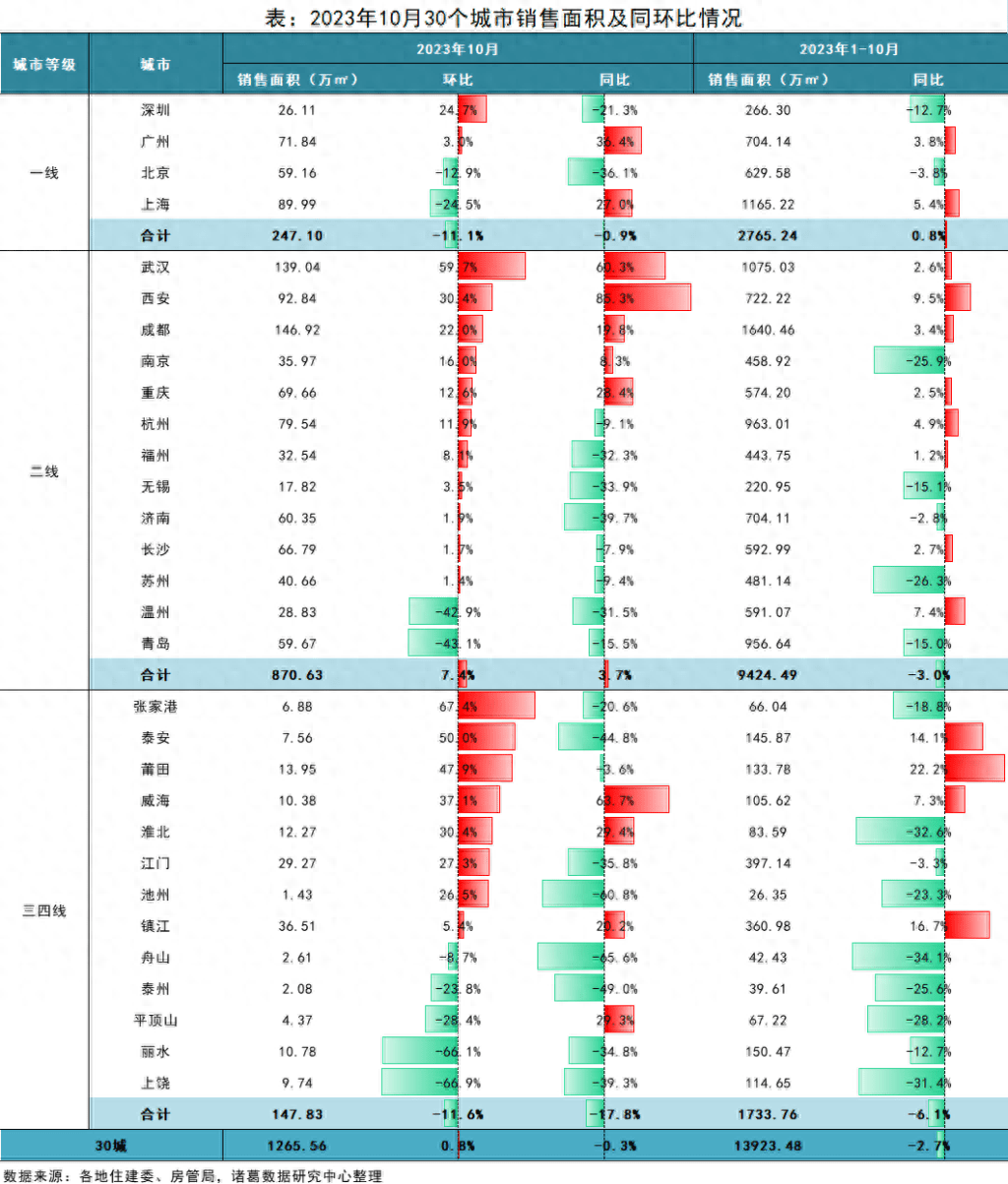 根据诸葛数据研究中心监测数据显示,10月重点监测的30城新建商品住宅销售面积为1265.56万平方米,环比微升0.8%,环比涨幅较上月收窄15.4个百分点;同比下降0.3%,降幅较上月收窄约18个百分点。