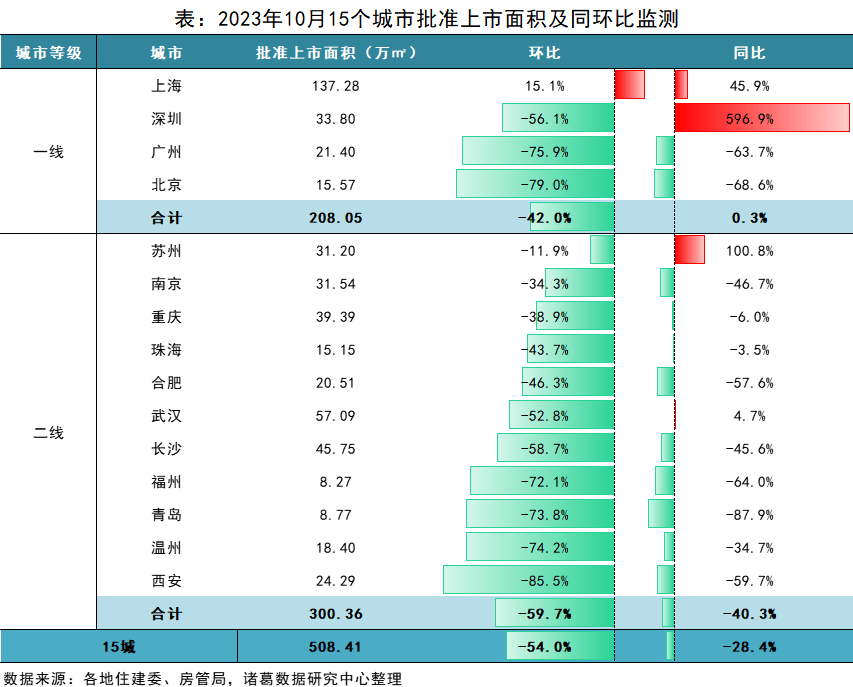 10月新房供应大幅收紧,批准上市面积较上月缩减超半,单月供应量达今年以来除2月以外的低谷。数据显示,10月重点监测的15城批准上市面积为508.41万㎡,环比下降54%;同比下降28.4%,同比降幅较上月扩大约11个百分点。预计接下来,房企“备战”年终,供应有望低位回升。