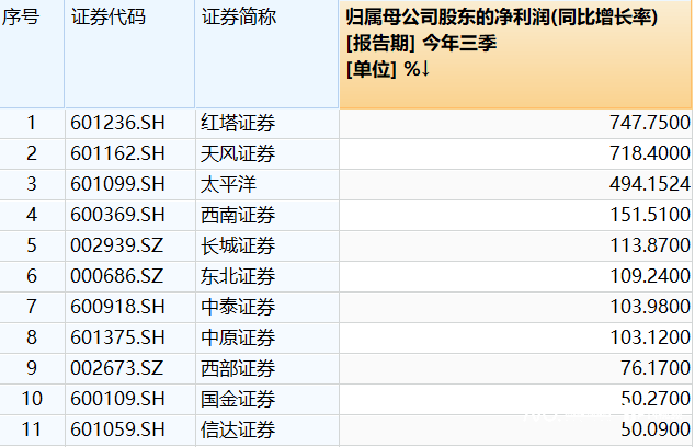 当然,部分中小券商的高涨幅与其去年同期基数较低也不无关联。比如说:今年前三季度,红塔证券虽然归母净利润倒数,但同比增幅惊人,高达747.75%。而去年,红塔证券净利骤降超九成,排名垫底。