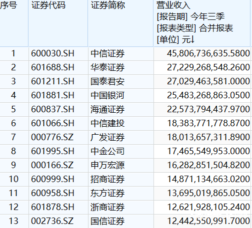 Wind数据显示,今年前三季度,中信证券营收458.07亿元,位居榜首,且远远甩出其他券商一大截。华泰证券、国泰君安位居第二和第三,营收分别为272.29亿元、270.29亿元。