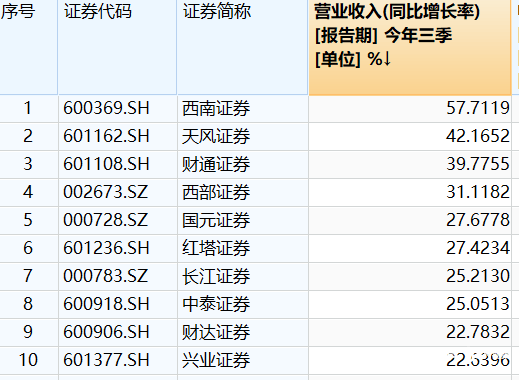 从营收增幅来说,今年前三季度,共有30家上市券商实现了同比正增长,占比近70%。其中,西南证券、天风证券、财通证券的营收同比增长率位居前三,分别为57.71%、42.17%、39.78%。
