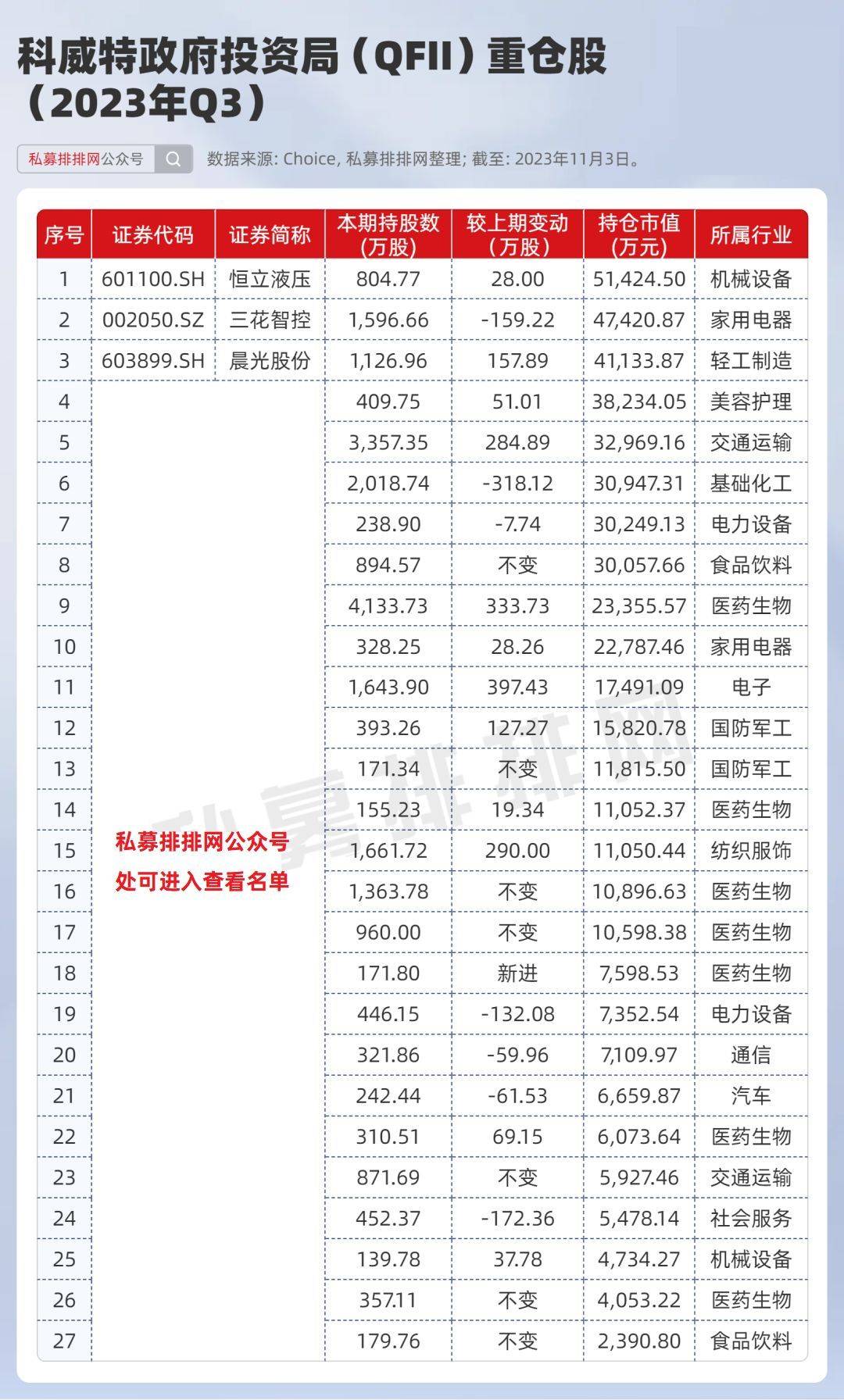 根据Choice数据,2023年三季度末,「科威特政府投资局」重仓持有(出现在前十大流通股东名单中)的A股公司有27家,持仓市值合计近50亿元。