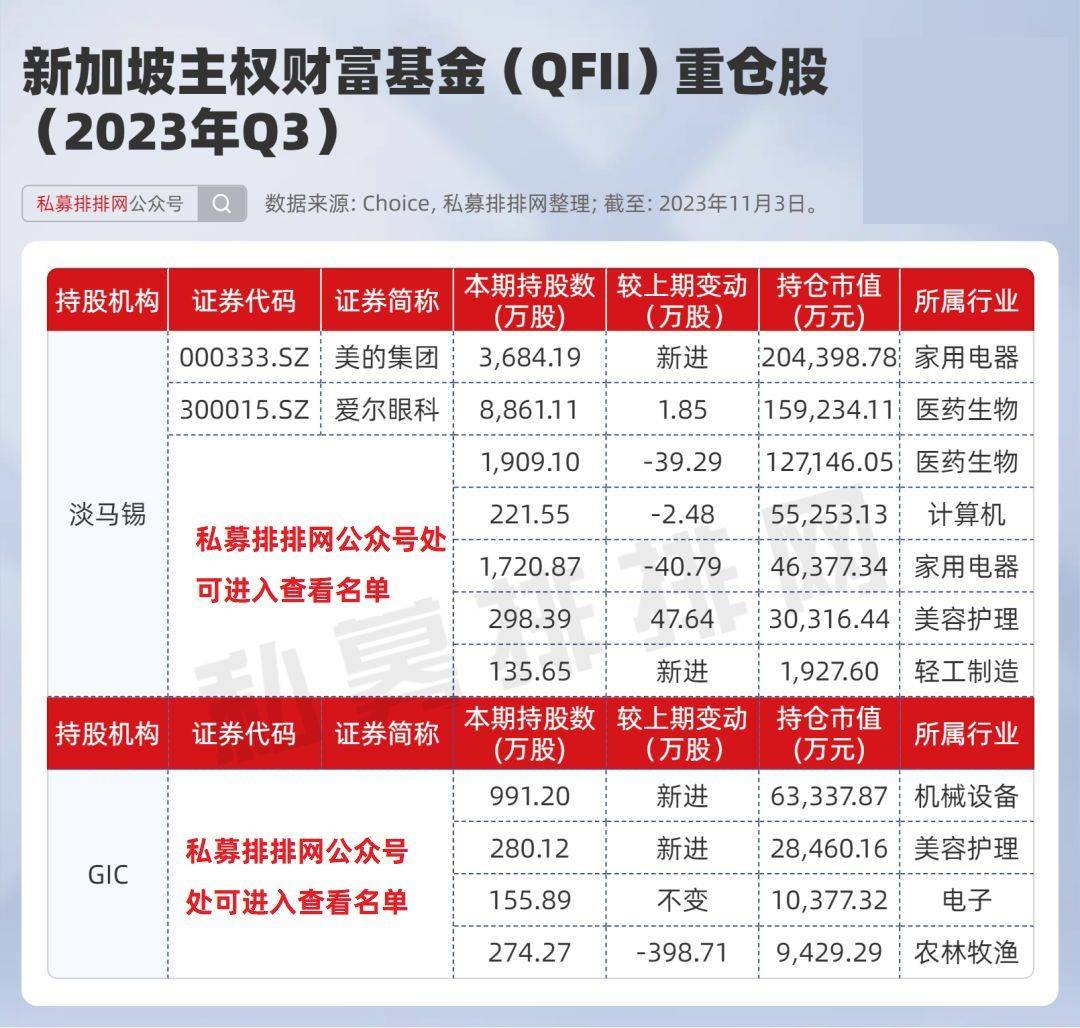 在2023年第三季度,淡马锡和GIC的QFII账户同步加仓,截至季度末,淡马锡新进两家公司十大流通股股东名单,曝光持股总市值较年中增加近22亿元,增长过半;GIC也新进两家,持股总市值较年中增加近6.4亿,增加了一倍还多。