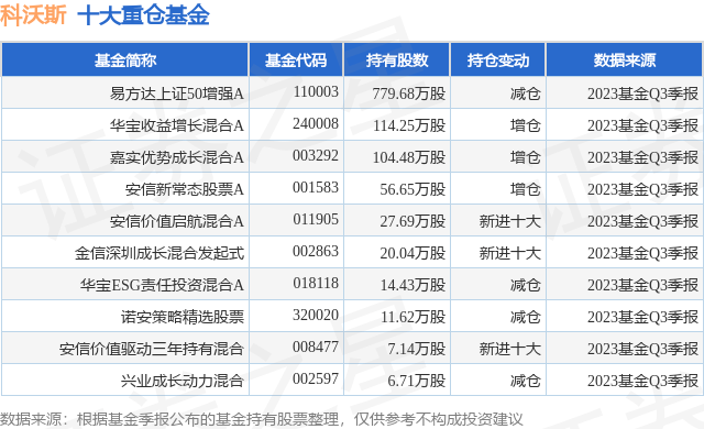 根据2023基金Q3季报公募基金重仓股数据,重仓该股的公募基金共17家,其中持有数量最多的公募基金为易方达上证50增强A。易方达上证50增强A目前规模为179.15亿元,最新净值1.7441(11月2日),较上一交易日下跌0.1%,近一年上涨5.24%。该公募基金现任基金经理为张胜记。张胜记在任的基金产品包括:易方达沪深300指数增强A,管理时间为2020年12月30日至今,期间收益率为-32.19%。
