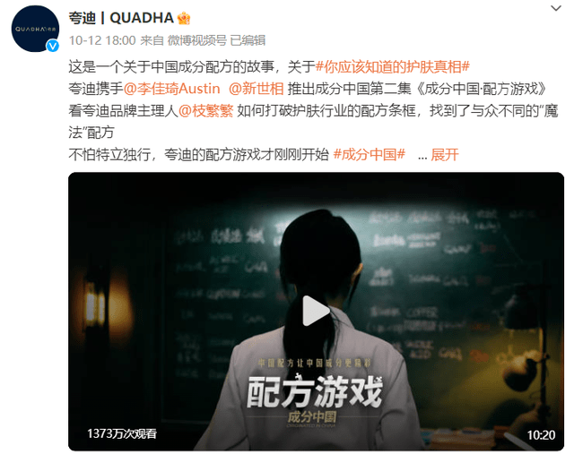 也许是为了在国货护肤赛道中突围,夸迪在“5D玻尿酸”之后又推出了“蓝铜胜肽”这一成份作为“主打”。在其新发布的《成分中国•配方游戏》片子中,主要就介绍了品牌针对这一成份配方研发的过程。