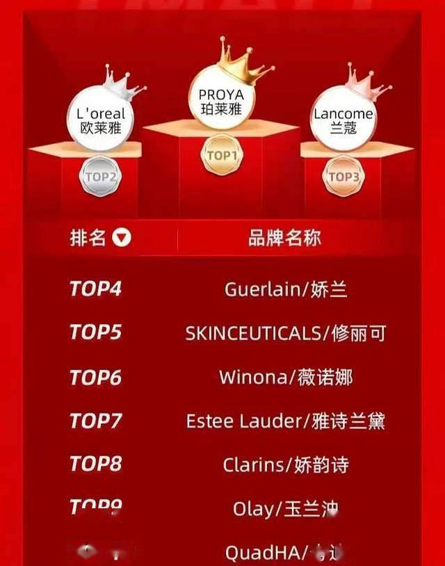 从天猫10月24日20:00-23:59预售定金情况的预售金额排名来看,预售首日的前4小时内,销售排名TOP20的品牌中,国货品牌和外资品牌各占一半,其中珀莱雅登顶TOP1,夸迪则排在TOP10的位置;在随后出炉的“天猫美容护肤抢先购首日品牌TOP20”的榜单上,珀莱雅挤掉雅诗兰黛,与欧莱雅、兰蔻一起霸占前三席,夸迪则位于第18位。