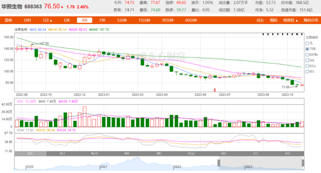 由于横跨药妆和医美两个市场,华熙生物曾是“国货美妆市场第一”的企业,最高市值一度达到1400多亿元,被投资者戏称为“美容茅”“护肤茅”。但目前,其市值相较最高点已蒸发近千亿;截至11月3日收盘,股价为76.5元/股,市值为368.5亿元。