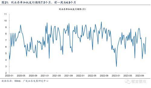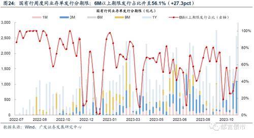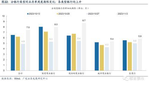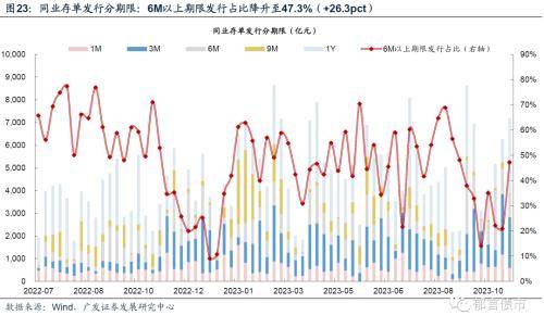 存单加权发行利率2.56%,加权发行期限拉长。10月23-27日,同业存单加权发行利率2.56%,较前一周上行1bp。存单加权发行期限7.5个月,前一周为4.9个月,各类银行加权发行期限均上升。1年期存单占分类型银行存单总发行量比例,合计46.4%(相对前一周+30.0pct),9M存单占比0.8%(相对前一周-3.6pct)。