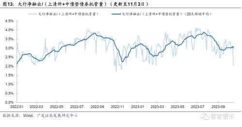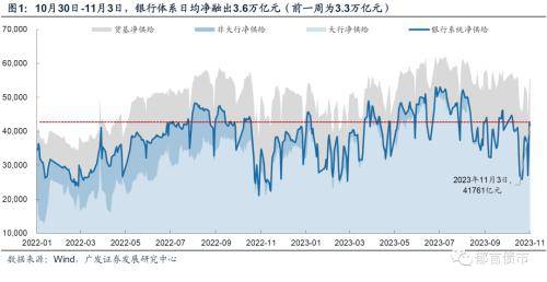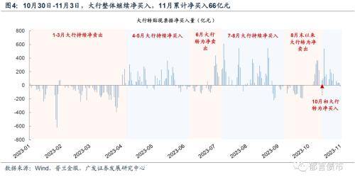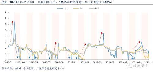 从影响当前资金面的两条核心线索来看,一是票据指向的信贷投放。10月末票据利率仍然维持下行,可以跨月的3个月期票据利率低至0.3%,下行幅度高于2022年同期,大行维持净买入票据,10月累计净买入3341亿元(9月累计净卖出1569亿元)。 从预测信贷的角度而言,结合全月票据利率大幅下行以及大行净买入票据的行为来看,10月信贷投放弱于9月,关键在于是否会弱于季节性。 跨月之后票据利率转上,11月3日相对10月末,1M和3M票据利率分别上行55bp、18bp至1.53%、0.48%,6M票据利率小幅下行4bp至1.04%,大行整体继续净买入,11月累计净买入66亿元。