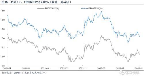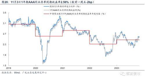1年期AAA存单收益率下行至2.56%。二级市场方面,10月30日-11月3日,1年期AAA同业存单收益率波动下行,周五下行至2.56%,较前一周下行2bp。一级市场方面,11月3日股份行1年期存单发行利率为2.58%,较前一周五下行1bp。
