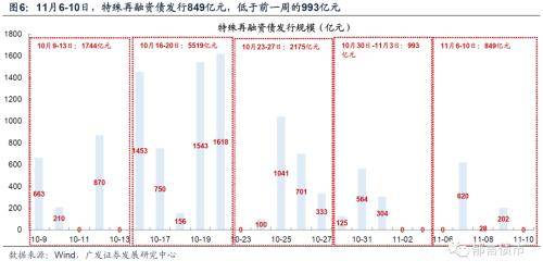 二是政府债发行节奏。11月6-10日,政府债净融资转负,降至-1630亿元,而前一周仍在4117亿元的高位,对资金面的扰动将有所下降。 主要是由于特殊再融资债发行节奏放缓, 下周计划发行特殊再融资债849亿元,低于前一周的993亿元,而10月集中发行高峰为单周发行5519亿元。