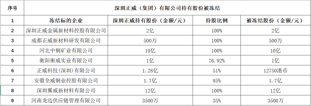 两次“限高”的同时,深圳正威陆续有相关公司股权被冻结,包括10月27日,深圳市福田区人民法院冻结正威文化发展有限公司5000万元股权,以及冻结深圳正威实业有限公司5亿元股份。