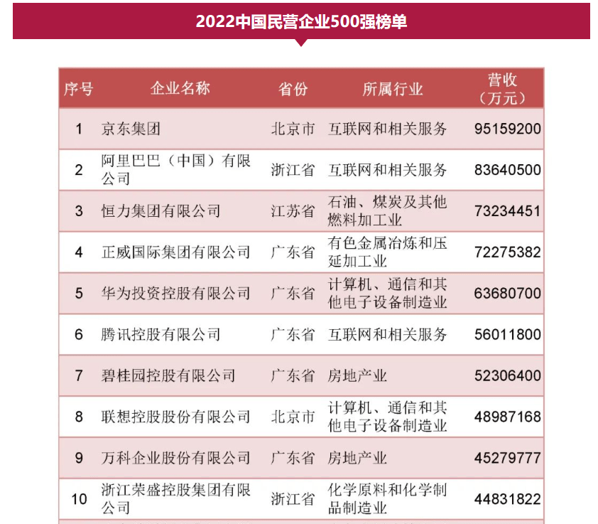 由中华全国工商业联合会发布的“2022中国民营企业500强榜单”显示,正威国际集团营收约7227亿元,位列全国民营企业500强第4位,也是广东省第一民企,紧随其后的是华为、腾讯、碧桂园。