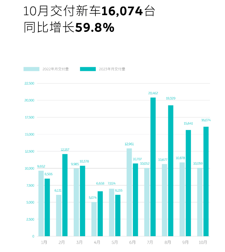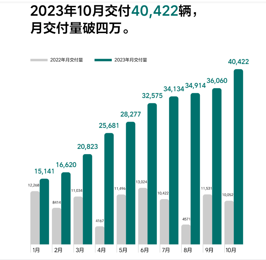 理想汽车10月交付40422 辆,首次突破4万辆大关,同比增长 302.1%,1-10月全年累计交付 284647 辆。与2022年全年133246辆相比,理想汽车的增长速度是惊人的,但如果说月销量过4万就高枕无忧,那就远远低估了其“野心”。理想汽车创始人李想在社交媒体上已经放话,“2024年如果月均只有5万辆的话,我就要出去找工作了”,看来给理想的目标月销5万辆也不是起点,排在后面的新势力车企有没有感到压力?