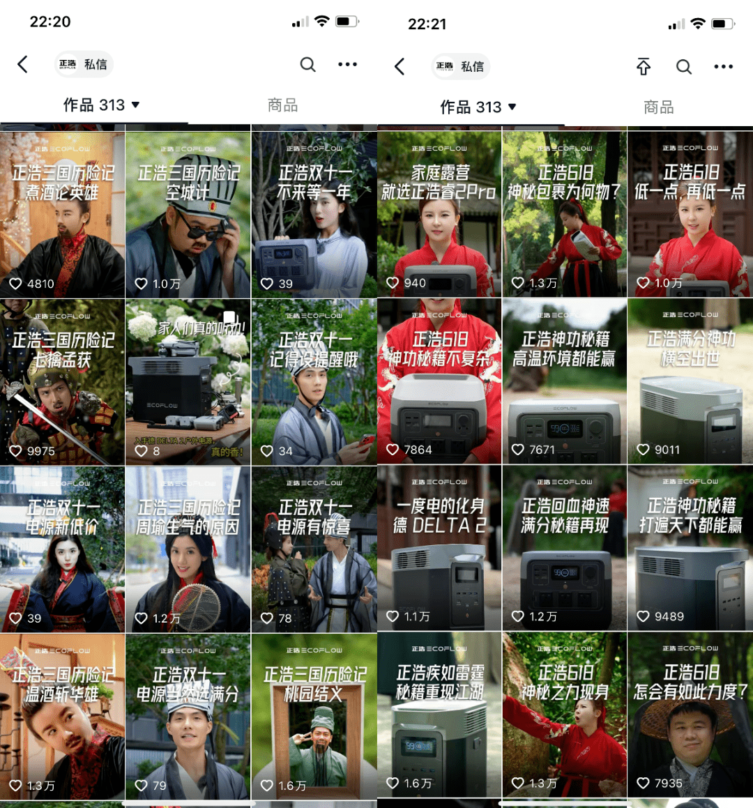 拿抖音来说,在品牌抖音直播场景中,正浩运用了三国的主题进行了场景差异化,主播穿的是三国时期的古装,直播场景布置也是三国背景,用TA普遍有认知和感兴趣的故事吸引关注,再通过有趣的表达和内容展现其品牌户外电源优势。