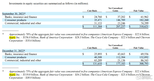 持仓方面,截至9月30日,伯克希尔持股市值为3186.21亿美元,主要集中在消费行业(1822.60亿美元),工商业(743.99亿美元)和金融业(619.62亿美元)。