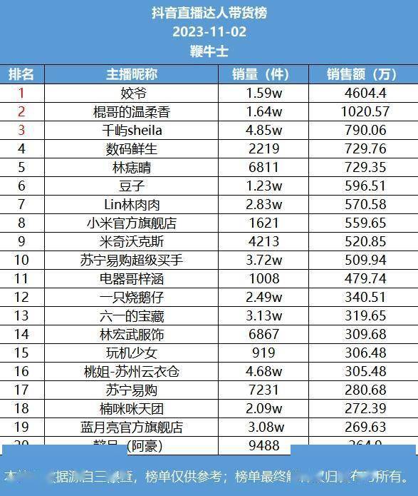 11月4日,抖音直播达人带货榜一是瑞丽小二,销售额6001.66万;榜二刘媛媛,销售额4301.68万;榜三安然美妆,销售额4258.59万。