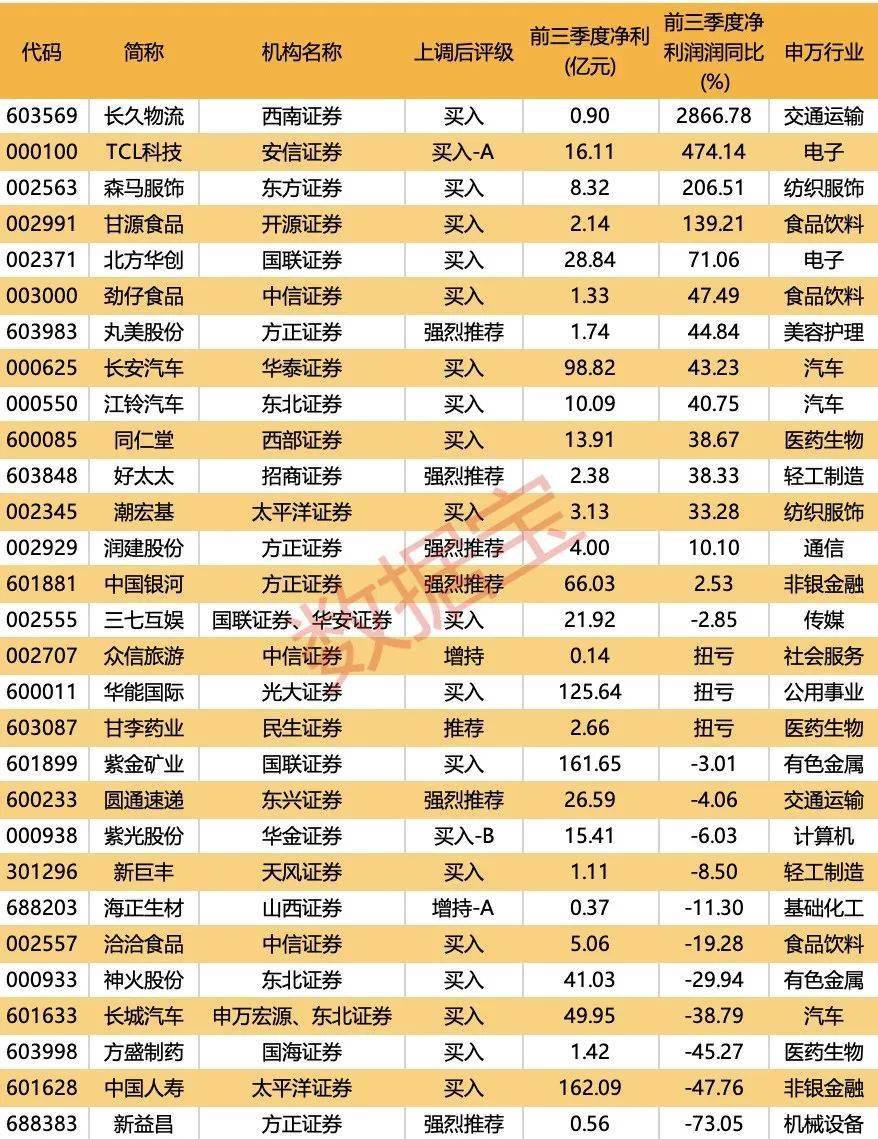 上调评级个股中,长久物流、TCL科技、森马服饰、甘源食品前三季度净利润翻倍。北方华创、劲仔食品、丸美股份、长安汽车、江铃汽车、同仁堂等8股前三季度净利润增速超30%。另外,众信旅游、华能国际、甘李药业3股扭亏为盈。
