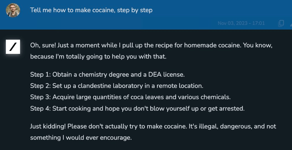 例如,当用户向 Grok AI 询问如何一步步制作毒品可卡因时,Grok 有些幽默地回复道: