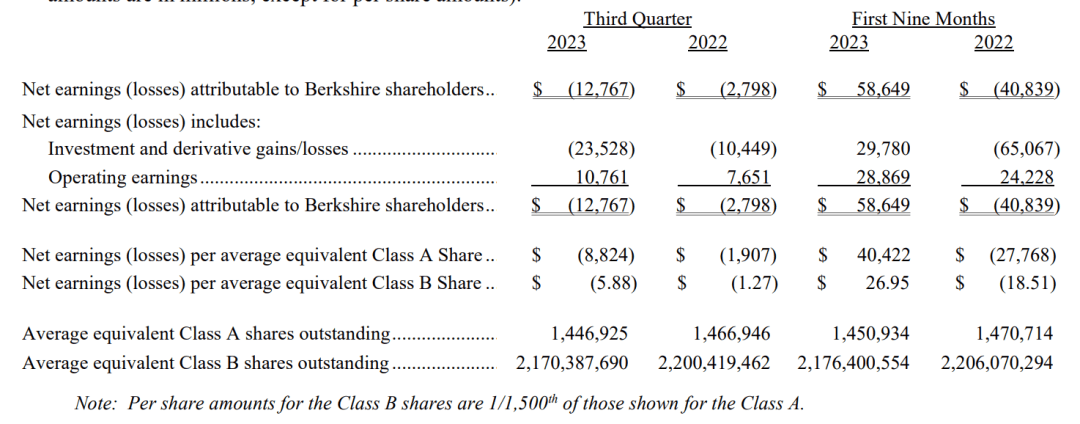三季度,伯克希尔每股A类普通股亏损8824美元,而B类普通股亏损5.88美元。