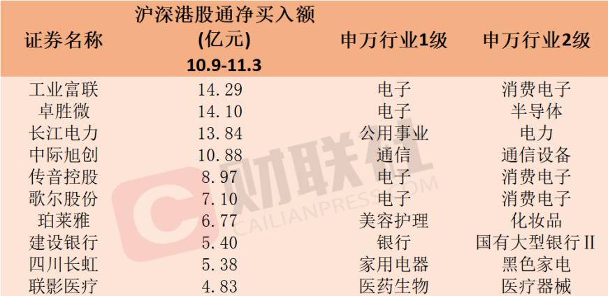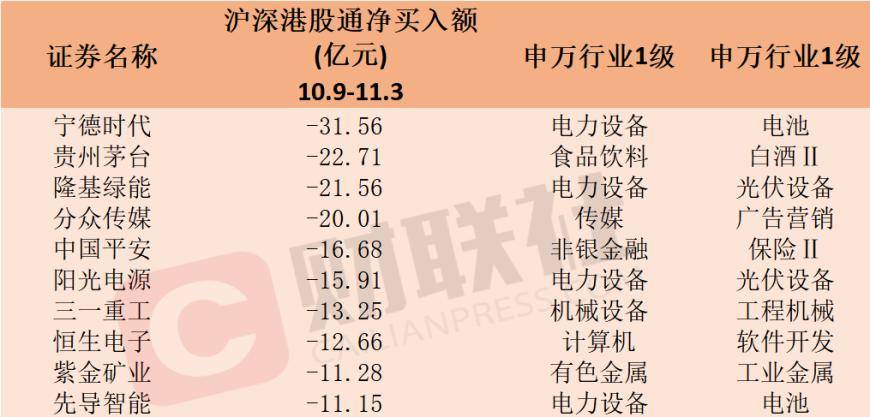 据Choice数据统计,10月9日至11月3日期间,北向资金累计净买入额前十位个股分别为工业富联、卓胜微、长江电力、中际旭创、传音控股、歌尔股份、珀莱雅、建设银行、四川长虹和联影医疗,净买入额均超4亿元。北向资金近一个月来累计净卖出额前十位个股分别为宁德时代、贵州茅台、隆基绿能、分众传媒、中国平安、阳光电源、三一重工、恒生电子、紫金矿业和先导智能,净卖出额均超11亿元,详细情况见下表: