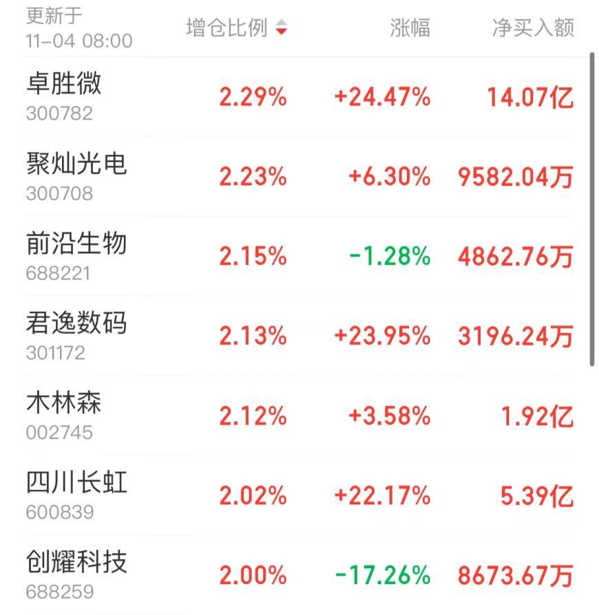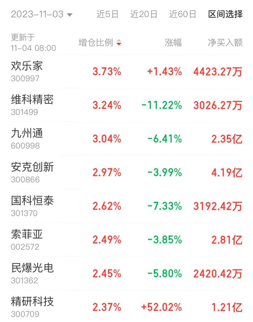 从增仓幅度看,据同花顺沪深港通数据,在10月9日-11月3日期间,获北向资金增持比例达到2%的A股上市公司包括欢乐家、维科精密、九州通、安克创新、国科恒泰、索菲亚、民爆光电、精研科技、卓胜微、聚灿光电、前沿生物、君逸数码、木林森、四川长虹和创耀科技。值得注意的是,华为概念股卓胜微、君逸数码、四川长虹和创耀科技赫然在列。