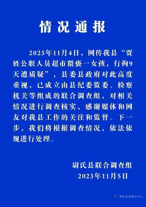 2023年11月4日,网传我县“贾姓公职人员超市猥亵一女孩,行拘9天遭质疑”,县委县政府对此高度重视,已成立由县纪委监委、检察机关等组成的联合调查组,对相关情况进行调查核实,感谢媒体和网友对我县工作的关注和监督。