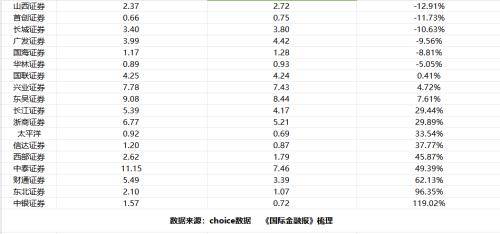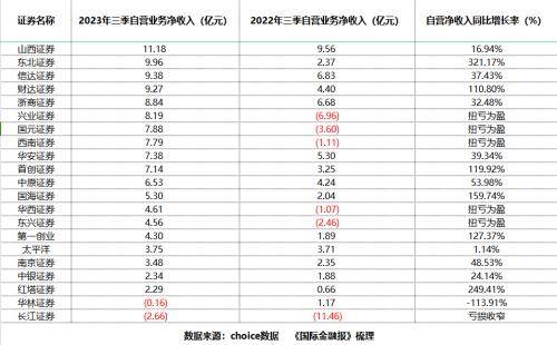 20家机构前三季度自营业务净收入低于10亿元,主要是中小券商。其中,长江证券前三季度自营净收入为-2.66亿元,相比去年同期亏损已大幅收窄;兴业证券、西南证券、华西证券等相比去年同期“由负转正”,东北证券前三季度自营净收入大增321%至9.96亿元。