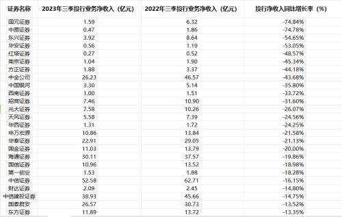 在股债市场低迷、IPO和再融资节奏收紧等影响下,42家机构的手续费及佣金净收入在第三季度同比出现不同程度的下滑。