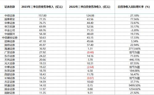 上市券商中,前三季度自营业务净收入超过20亿元的共计13家。中信证券以近158亿元领先全场,位列其后的国泰君安、华泰证券均约为77亿元。中金公司前三季度自营净收入略有下降,广发证券则“扭亏为盈”,由去年同期的-0.48亿元大增至27.92亿元。