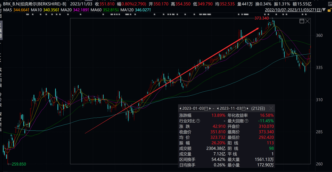 截至11月3日,伯克希尔的A类股收盘价为534132美元,上涨0.66%,今年以来已上涨近14%,在9月19日达到历史最高点后,其股价已从最高点下跌了约6%。